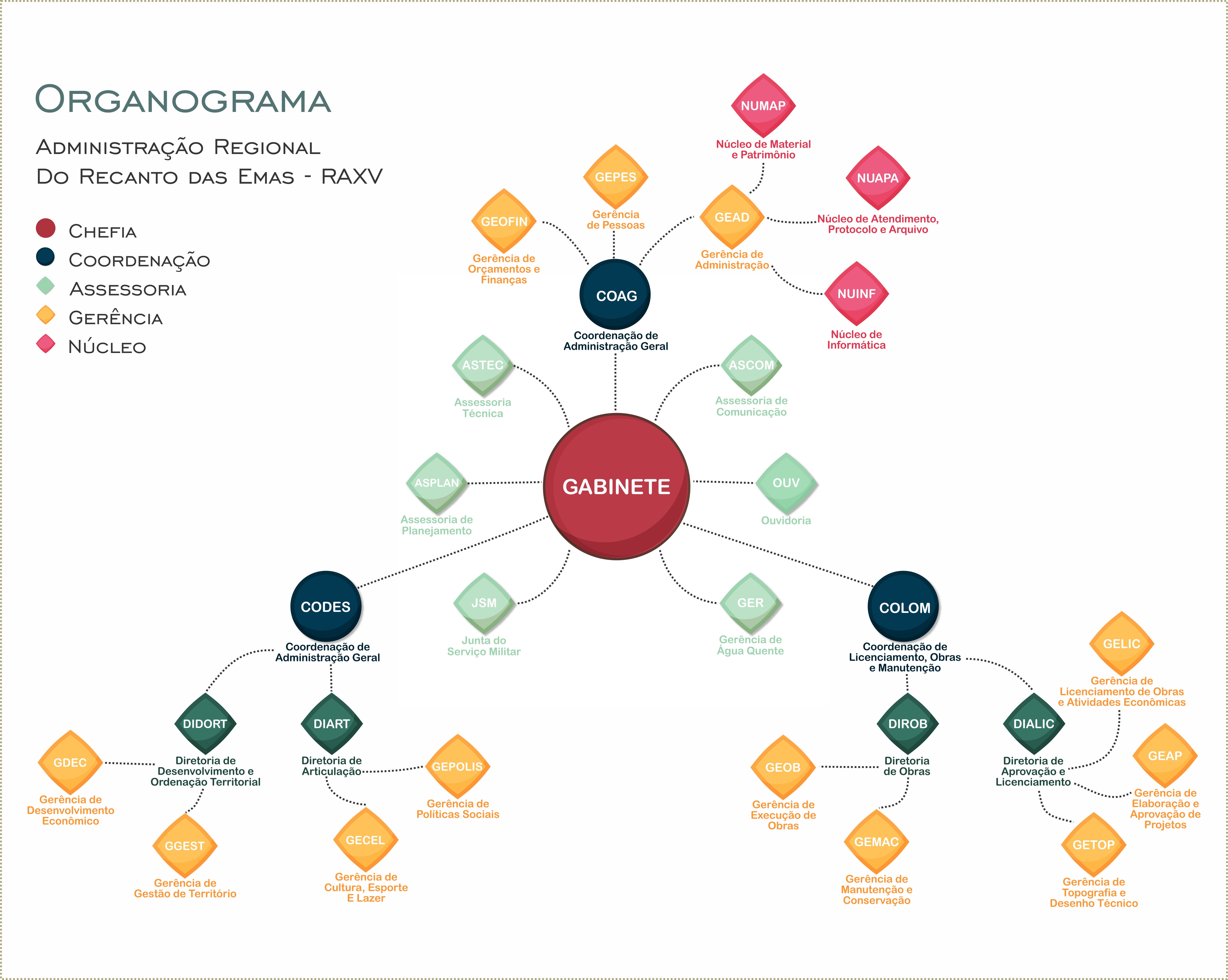 A Estrutura desta Administração Regional está de acordo com o DECRETO Nº 38.094, DE 28 DE MARÇO DE 2017 (Alterado pelos Decreto nº 38.326, de 10/07/2017 e Decreto nº 39.467 de 21/11/2018)